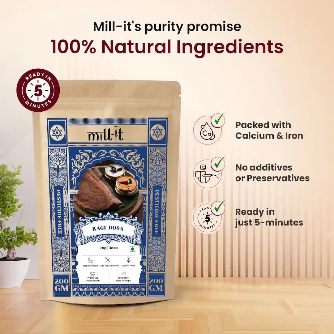 Discover the wholesome goodness of Ragi Dosa Mix, crafted with nutrient-rich ragi for a crispy dosa. Packed with calcium and protein, it supports bone health and provides sustained energy, making it ideal for breakfast or a light meal. Quick and easy to prepare, Ragi Dosa Mix brings the earthy, traditional flavor of ragi to your plate in minutes. Just add water, cook on a hot pan, and enjoy with chutney or sambar.
