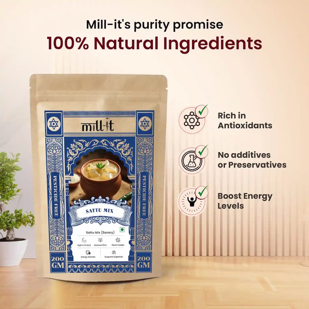Discover the wholesome power of Mill-it’s Sattu Premix—a nourishing blend crafted from roasted kala chana, oats, and seasoned with an array of natural spices. Packed with plant-based protein, fiber, and essential minerals, this energizing mix aids digestion, boosts stamina, and keeps you cool and revitalized. Enjoy it as a refreshing drink or a hearty meal addition—pure, flavorful wellness in every scoop!
