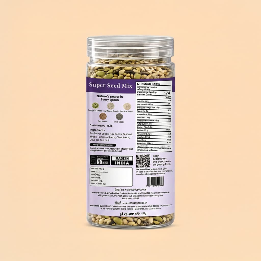Explore the wholesome energy of our Seed Mix—a nutrient-dense combination of pumpkin, chia, flaxseed, sesame, and sunflower seeds. This powerful combination is packed with plant protein, omega-3, fiber, and vital minerals for maintaining heart health, easing digestion, and sustaining you all day long. Use it as a topping for salads and yogurt or as a crunchy side—all pure and delicious in every bite!